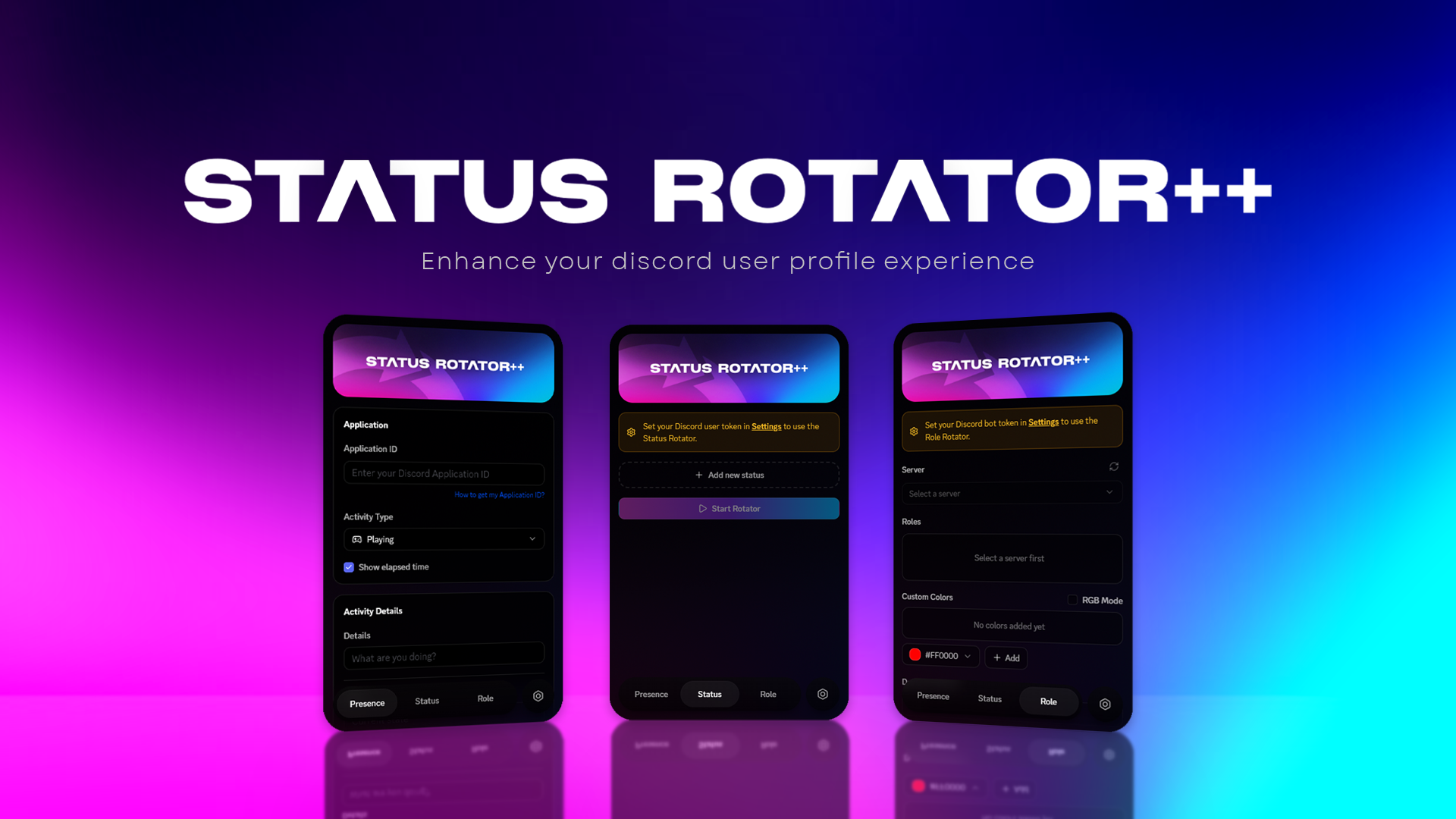 Discord bot for animated status rotation. Also available as a desktop app with additional features like custom rich presence, RGB role colors, and profile customization.